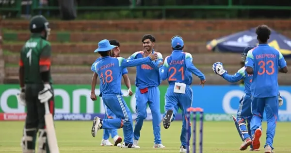 बुलावायो में खेले गए अंडर-19 वर्ल्ड कप के मुकाबले में भारतीय युवा टीम ने शानदार प्रदर्शन करते हुए बांग्लादेश को 18 रन से पराजित कर दिया। बारिश से प्रभावित इस मैच में डकवर्थ–लुईस नियम के तहत बांग्लादेश को 29 ओवर में 165 रनों का लक्ष्य मिला था, लेकिन भारतीय स्पिनरों की बेहतरीन गेंदबाजी के सामने बांग्लादेश की टीम 28.3 ओवर में 146 रनों पर सिमट गई।