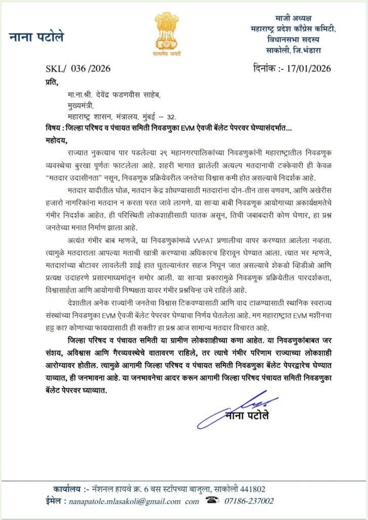 मुंबई :महाराष्ट्र में जिला परिषद और पंचायत समिति चुनावों को लेकर राजनीतिक माहौल गरमा गया है। कांग्रेस के पूर्व प्रदेश अध्यक्ष और विधायक नाना पटोले ने इन चुनावों को EVM के बजाय बैलेट पेपर से कराने की जोरदार मांग की है। इस संबंध में उन्होंने राज्य के मुख्य चुनाव आयुक्त और मुख्यमंत्री देवेंद्र फडणवीस को पत्र लिखकर हाल ही में संपन्न महानगरपालिका चुनावों पर गंभीर सवाल खड़े किए हैं।