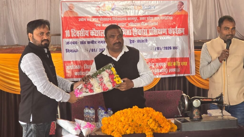 संतकबीरनगर के खलीलाबाद स्थित मंगलम मैरेज हॉल में उत्तर प्रदेश सरकार की महत्वाकांक्षी एक जनपद–एक उत्पाद (ODOP) योजना के तहत संचालित 10 दिवसीय प्रशिक्षण कार्यक्रम लगातार महिलाओं को आत्मनिर्भर बनाने की दिशा में आगे बढ़ रहा है। रविवार को प्रशिक्षण के तीसरे दिन नगर पालिका परिषद खलीलाबाद के अध्यक्ष जगत जायसवाल मुख्य अतिथि के रूप में कार्यक्रम में शामिल हुए और प्रशिक्षण प्राप्त कर रही महिलाओं को आत्मनिर्भर बनने का प्रेरक संदेश दिया।